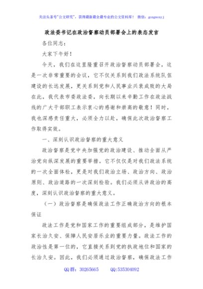 / 政法委书记在政治督察动员部署会上的表态发言