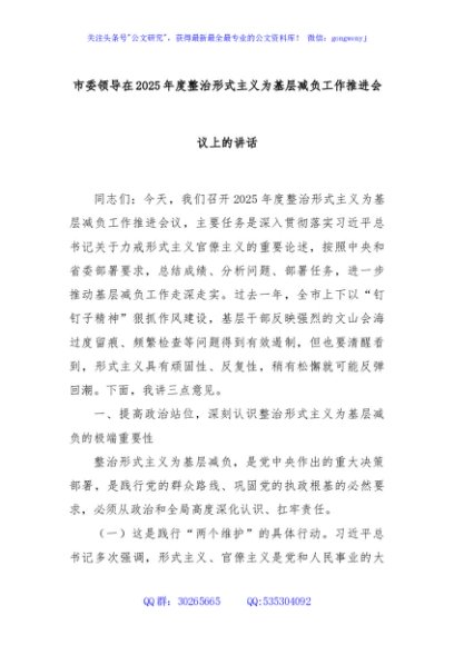 / 市委领导在2025年度整治形式主义为基层减负工作推进会议上的讲话