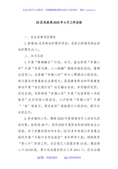 / XX区民政局2025年4月工作总结