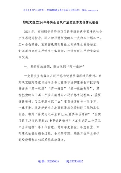 / 妇联党组2024年落实全面从严治党主体责任情况报告