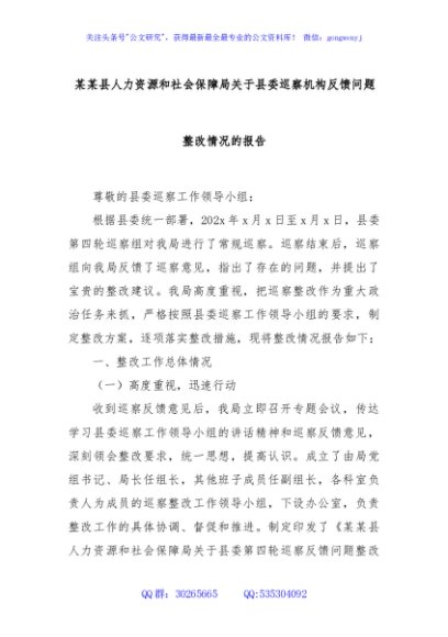 / 某某县人力资源和社会保障局关于县委巡察机构反馈问题整改情况的报告