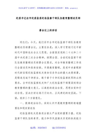 / 纪委书记在市纪委监委纪检监察干部队伍教育整顿动员部署会议上的讲话