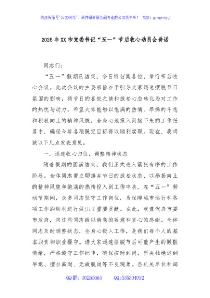 / 2025年XX市党委书记“五一”节后收心动员会讲话