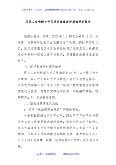 / 区总工会党组关于区委巡察整改进展情况的报告