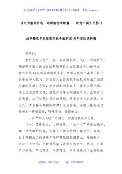 / 以史为鉴怀壮志,砥砺前行谱新篇——纪念中国人民抗日战争暨世界反法西斯战争胜利80周年思政课讲稿
