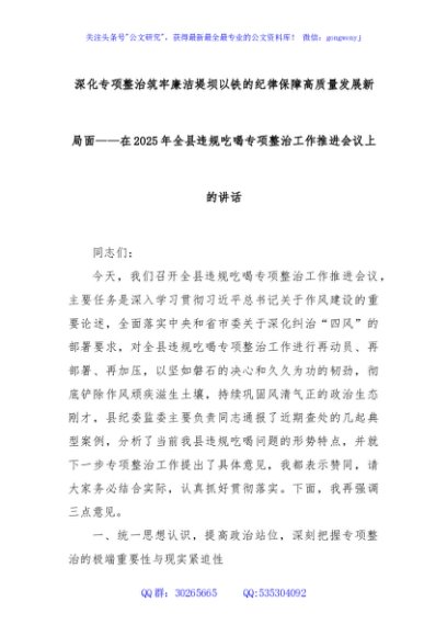 / 深化专项整治筑牢廉洁堤坝以铁的纪律保障高质量发展新局面——在2025年全县违规吃喝专项整治工作推进会议上的讲话