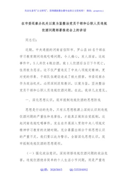 / 在市委巡察办机关以案为鉴整治党员干部和公职人员违规饮酒问题部署推进会上的讲话