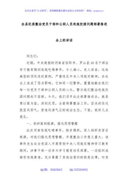 / 在县纪委整治党员干部和公职人员违规饮酒问题部署推进会上的讲话