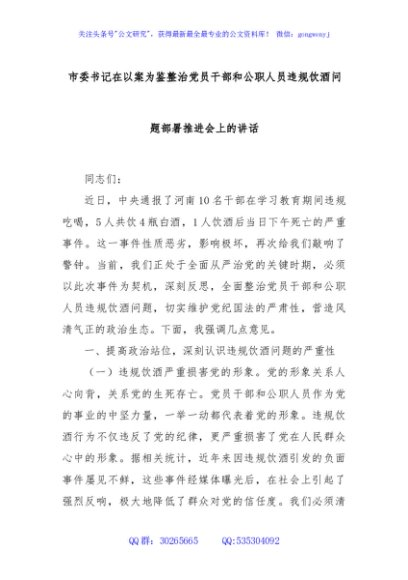 / 市委书记在以案为鉴整治党员干部和公职人员违规饮酒问题部署推进会上的讲话