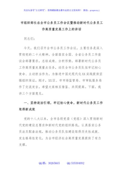 / 市组织部长在全市公务员工作会议暨推动新时代公务员工作高质量发展工作上的讲话