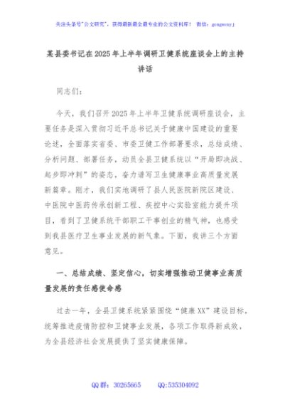 / 某县委书记在2025年上半年调研卫健系统座谈会上的主持讲话