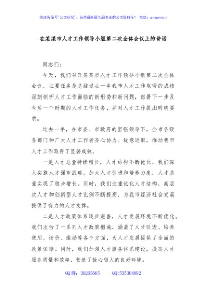/ 在某某市人才工作领导小组第二次全体会议上的讲话