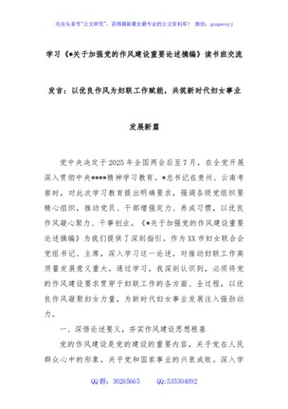 / 学习《关于加强党的作风建设重要论述摘编》读书班交流发言:以优良作风为妇联工作赋能,共筑新时代妇女事业发展新篇