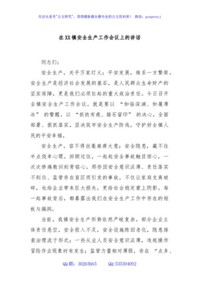 / 在XX镇安全生产工作会议上的讲话