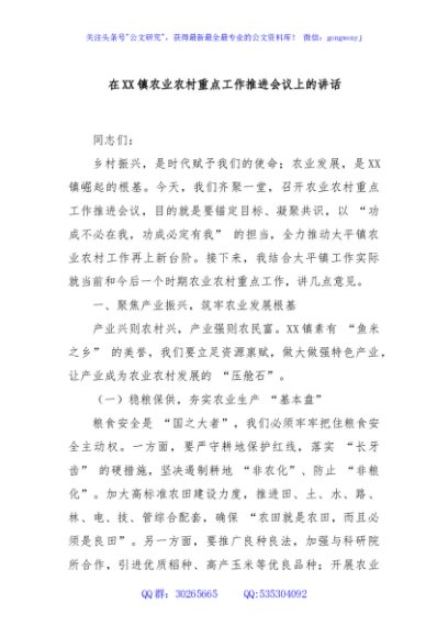 / 在XX镇农业农村重点工作推进会议上的讲话