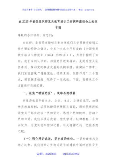 / 在2025年省委组织部党员教育培训工作调研座谈会上的发言稿