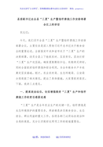 / 县委副书记在全县“三夏”生产暨秸秆禁烧工作安排部署会议上的讲话
