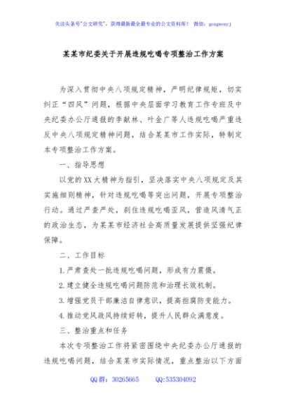 / 某某市纪委关于开展违规吃喝专项整治工作方案