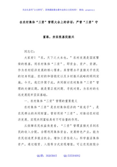 / 在农村集体“三资”管理大会上的讲话:严管“三资”守富路,夯实根基促振兴