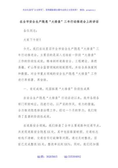 / 在全市安全生产隐患“大排查”三年行动推进会上的讲话