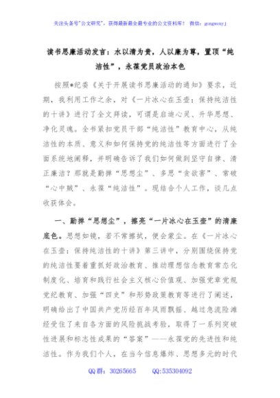 / 读书思廉活动发言:水以清为贵,人以廉为尊,置顶“纯洁性”,永葆党员政治本色