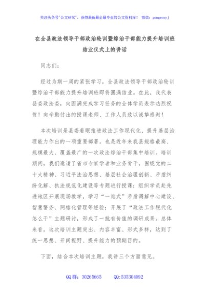 / 在全县政法领导干部政治轮训暨综治干部能力提升培训班结业仪式上的讲话