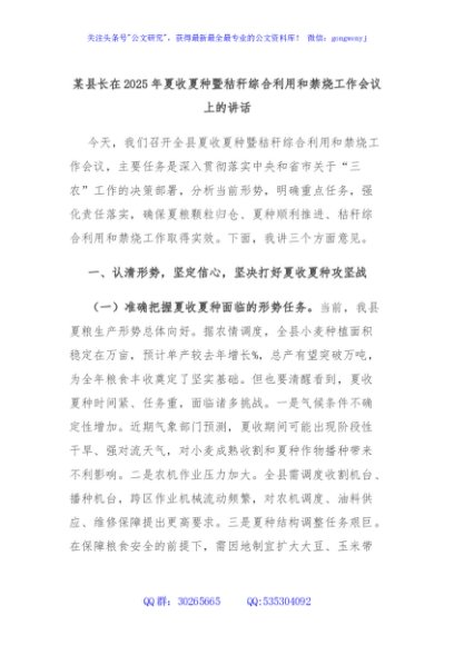/ 某县长在2025年夏收夏种暨秸秆综合利用和禁烧工作会议上的讲话