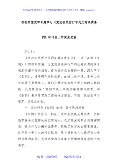 / 在机关党支部专题学习《党政机关厉行节约反对浪费条例》研讨会上的交流发言