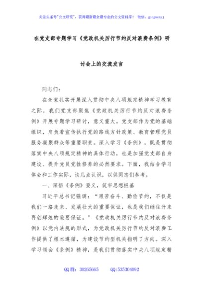/ 在党支部专题学习《党政机关厉行节约反对浪费条例》研讨会上的交流发言