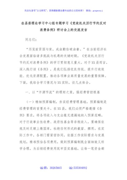 / 在县委理论学习中心组专题学习《党政机关厉行节约反对浪费条例》研讨会上的交流发言