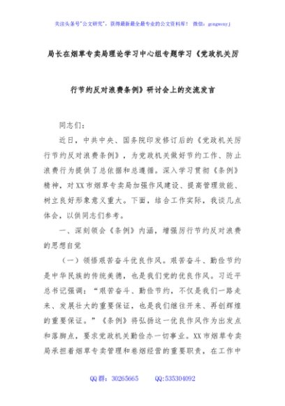 / 局长在烟草专卖局理论学习中心组专题学习《党政机关厉行节约反对浪费条例》研讨会上的交流发言