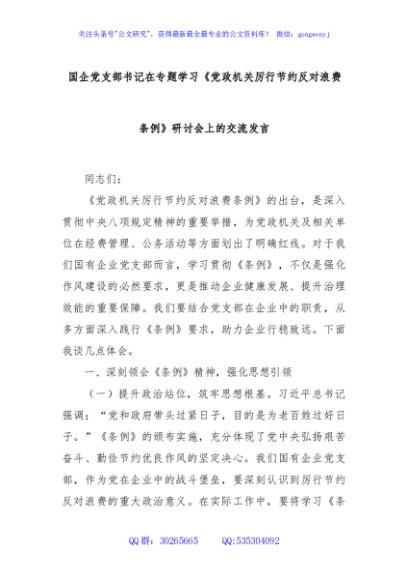 / 国企党支部书记在专题学习《党政机关厉行节约反对浪费条例》研讨会上的交流发言