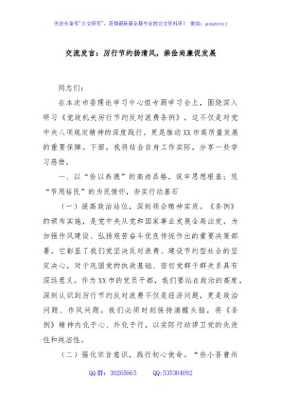 / 交流发言:厉行节约扬清风,崇俭尚廉促发展