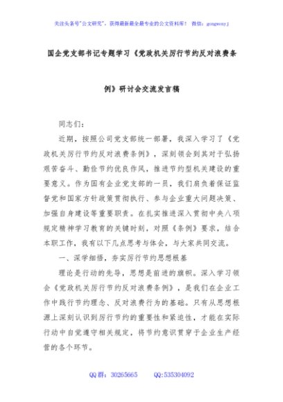 / 国企党支部书记专题学习《党政机关厉行节约反对浪费条例》研讨会交流发言稿