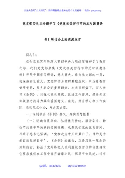 / 党支部委员在专题学习《党政机关厉行节约反对浪费条例》研讨会上的交流发言