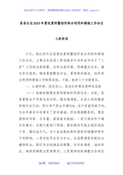 / 某县长在2025年夏收夏种暨秸秆综合利用和禁烧工作会议上的讲话