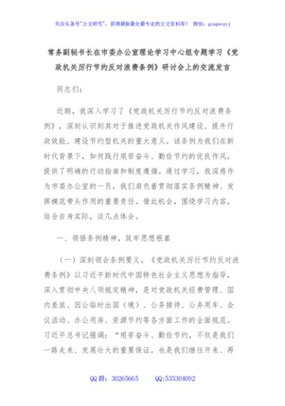 / 常务副秘书长在市委办公室理论学习中心组专题学习《党政机关厉行节约反对浪费条例》研讨会上的交流发言