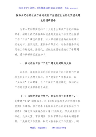 / 税务局纪检组长关于推进纪检工作规范化法治化正规化建设的调研报告