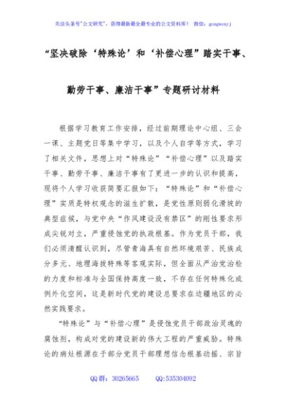 / “坚决破除‘特殊论’和‘补偿心理” 踏实干事、勤劳干事、廉洁干事”专题研讨材料