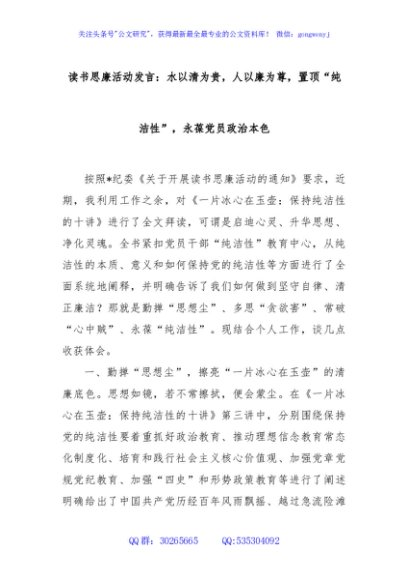 / 读书思廉活动发言:水以清为贵,人以廉为尊,置顶“纯洁性”,永葆党员政治本色