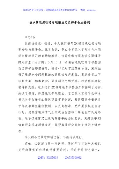 / 在乡镇违规吃喝专项整治动员部署会主持词