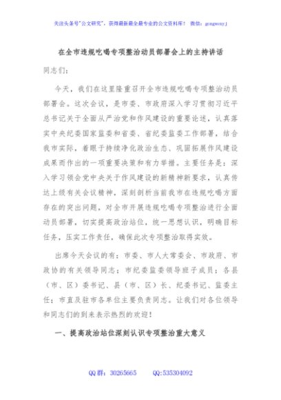 / 在全市违规吃喝专项整治动员部署会上的主持讲话