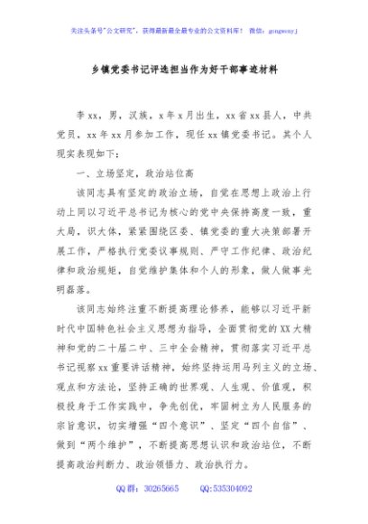/ 乡镇党委书记评选担当作为好干部事迹材料