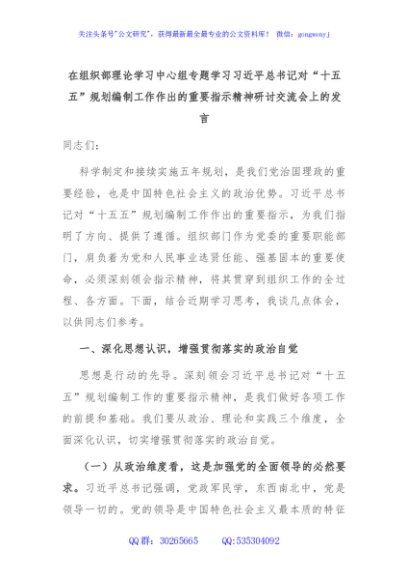 / 在组织部理论学习中心组专题学习习近平总书记对“十五五”规划编制工作作出的重要指示精神研讨交流会上的发言