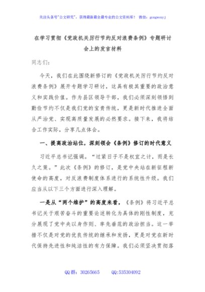/ 在学习贯彻《党政机关厉行节约反对浪费条例》专题研讨会上的发言材料