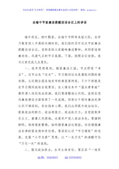 / 在端午节前廉洁提醒谈话会议上的讲话