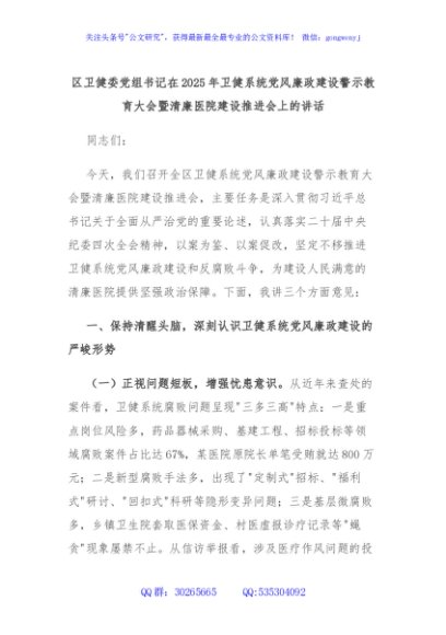 / 区卫健委党组书记在2025年卫健系统党风廉政建设警示教育大会暨清廉医院建设推进会上的讲话