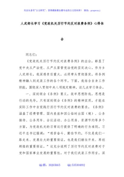 / 人武部长学习《党政机关厉行节约反对浪费条例》心得体会