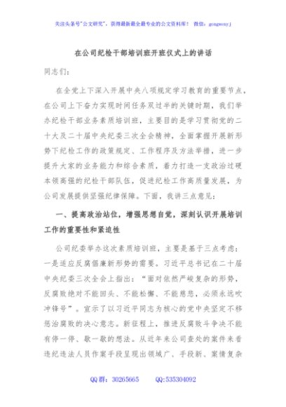 / 在公司纪检干部培训班开班仪式上的讲话