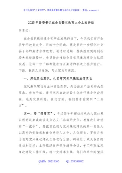 / 2025年县委书记在全县警示教育大会上的讲话
